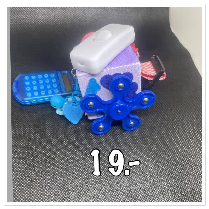 Les Busy cubes avec calculatrice en plastique, et petit bouton rouge et noir ON OFF idéal des 3,5 ans - 4 ans.